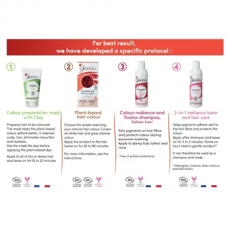 Tato rostlinná barva na vlasy Les couleurs de Jeanne je výsledkem dlouholetého vývoje a péče o každý detail. Vychází z tradičních receptur s použitím BIO indických bylin, jako je henna, amla, cassia či heřmánek. Bez syntetických přísad a 100% přírodní složení zaručuje perfektní barvení, skvělé krytí šedivých vlasů a výživu pro Vaše vlasy. Certifikována COSMOS a bez obsahu škodlivých látek, tato barva je ideální volbou pro ženy, které dbají o své vlasy i o životní prostředí. S postupem barvení a doporučenými produkty Les couleurs de Jeanne získáte nejen krásné a zdravé vlasy, ale i pocit spokojenosti s kvalitní péčí o sebe. Vyzkoušejte tuto rostlinnou barvu na vlasy a dejte svým vlasům to nejlepší, co příroda nabízí.